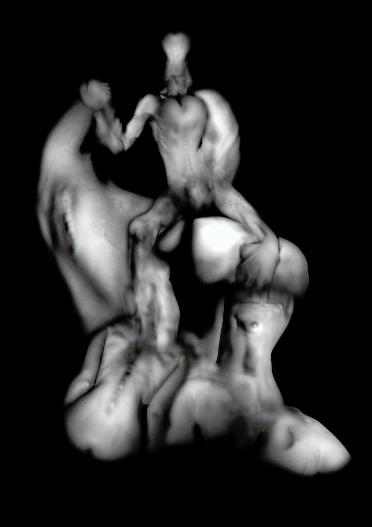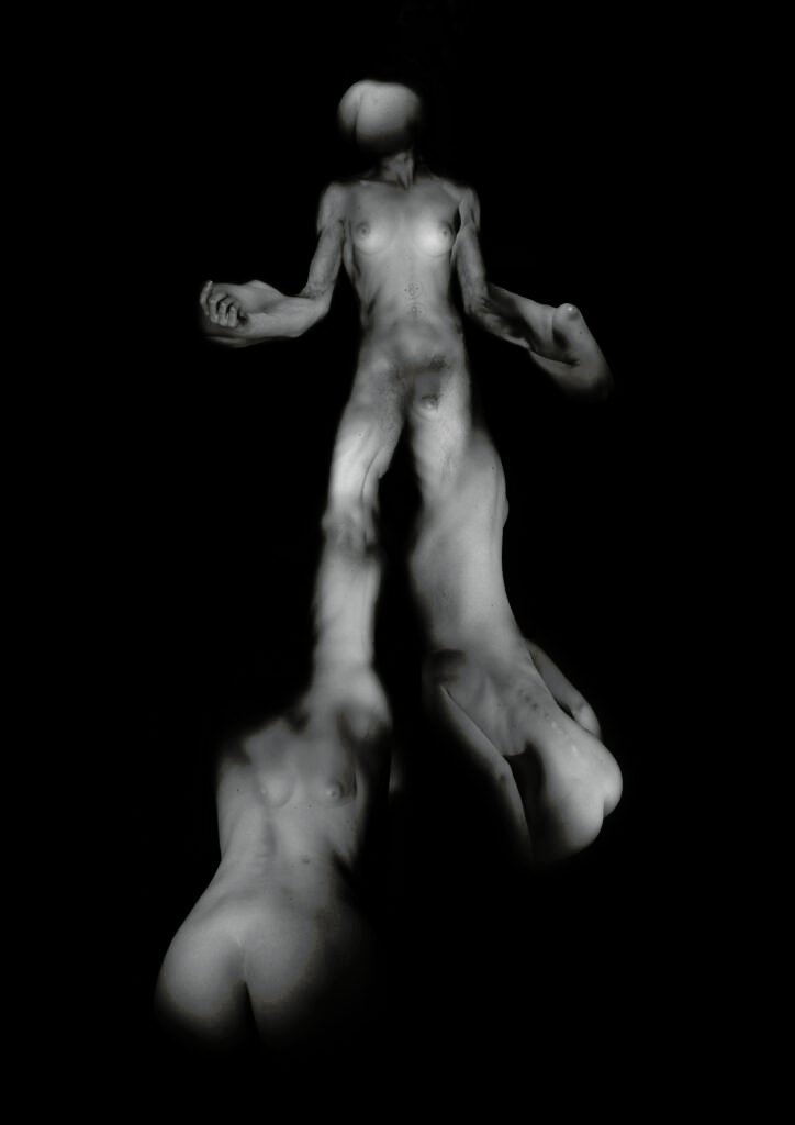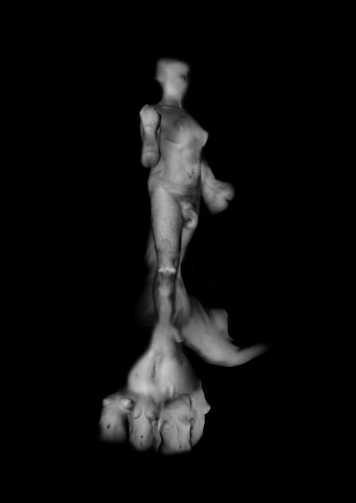En mélangeant les genres et en assemblant des greffages improbables, j’ interroge sur la quête de transformation sans limites et les risques de déviance. L’asexualisation de ses modèles brouille les repères, effaçant les distinctions traditionnelles entre masculin et féminin.